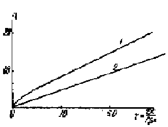 Результаты численного решения уравнения (7) показали, что при больших временах равновесное распределение является предельным для кинетических распределений. Для количественного представления эффективности процесса ВГ на рис. 3 представлена величина h-доля примеси, геттерированной на преципитате, как функция безразмерного времени. Кривые 1 и 2 описывают эффективность процесса ВГ соответственно с учетом и без учета упругого взаимодействия. Параметр g соответствует здесь относительному линейному несоответствию включения и полости в матрице, в которую он вставлен, равному 0,005, что типично для кислородного преципитата в кремнии, выращенном по методу Чохральского. Из рисунка видно, что дополнительный вклад геттерирования, вследствие упругого взаимодействия сопоставим с величиной геттерирования в отсутствие упругого взаимодействия. При этом процесс ВГ при упругом взаимодействии протекает быстрее .
