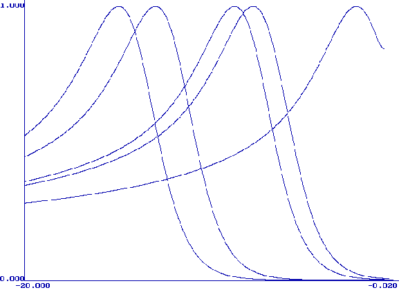Были составлены таблицы значений y¢(bt) при разных значениях H. На рис. 3 приведены нормированные (все максимумы сведены в точку (0;1)) графики функции y¢(bt) при H=0.1, 1, 3, 10, 100, 1000, 10000, 170000. Из этого рисунка видно, что при больших H форма кривой становится постоянной. Высота максимума при H³100 почти не меняется (0.298±0.002), а потенциал максимума смещается в область более положительных значений согласно уравнению (26):