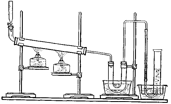 Если в нагреваемую на сильном пламени трубку (заполненную железными стружками для улучшения теплопередачи) пускать из воронки по каплям керосин или смазочное масло, очищенные от непредельных углеводородов (рис. 9), то в U-образной трубке вскоре будет собираться жидкость, а в цилиндре над водой — газ. Полученная жидкость, в отличие от взятой для реакции, обесцвечивает бромную воду, т. е. содержит непредельные соединения. Собранный газ хорошо горит и также обесцвечивает бромную воду.