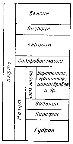 После перегонки мазута остаётся нелетучая тёмная масса — гудрон, идущая на асфальтирование улиц. Важнейшие продукты, получаемые из нефти, указаны в таблице (рис. 6).
