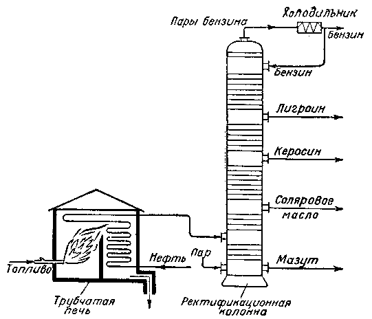 Перегонка нефти. Сначала перегонку нефти в промышленности производили по тому же принципу, что и в описанном выше лабораторном опыте. Нефть нагревали в особых резервуарах — «кубах», выделяющиеся пары отбирали в определённых интервалах температур и конденсировали, получая таким образом бензин, керосин и другие нефтепродукты. Но когда сильно возросла потребность в жидком топливе, такой способ оказался невыгодным, та к как он требовал много времени и большого расхода топлива на нагревание нефти, не обеспечивал высокой производительности и достаточно хорошего разделения нефти на отдельные нефтепродукты.