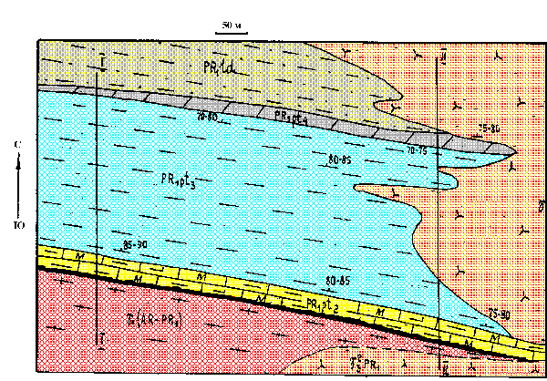 напряжением 6 кВ. 1-четвертичные отложения 2-граниты рапакиви (2 фаза) З-кварциты, полевошпат-биотитовые сланцы 4-кальцuфupы, мpaморы 5-полевошпатамфиболовые , графитсодержащие кварц-биотитовые скарны 6- пироксеновые , гранатовые, гранат-пироксеновые, магнетит-пироксеновые скарны 7-гнейсо-граниты