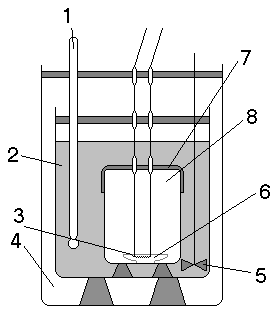 1 термометр. 2 вода. 3 электрическая спираль для сжигания образца. 4 воздушная рубашка. 5 мешалка. 6 тигель с анализируемым образцом. 7 кислород под давлением. 8 бомба калориметра