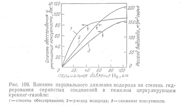 Если ресурсы водорода недостаточны, чтобы поддерживать данный режим, парциальное давление водорода приходится снижать, а для уменьшения расхода водорода — повышать температуру. Последнее обеспечивает усиление дегидрогенизации нафтеновых углеводородов. Однако значительное повышение температуры усиливает реакции гидрокрекинга, что нежелательно, так как это уменьшает выход целевых продуктов и сокращает срок службы катализатора. Снижение давления в реакторах гидроочистки с 40—50 до 28—30 ат позволило сократить расход водорода на установке на 30% без ухудшения качества очистки. Межрегенерационныйный период работы катализатора составил восемь месяцев. В дальнейшем были разработаны условия процесса с меньшим потреблением водорода. Они благоприятствуют наилучшему дегидрированию нафтеновых углеводородов, способствуя в то же время частичной гидрогенизации сернистых и смолистых соединений.