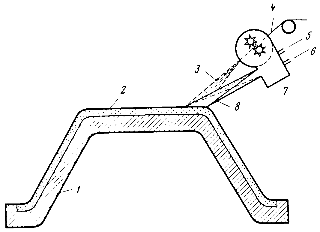 1 — форма; 2 — распыленная смесь нарезанного волокна и смолы; 3 — струя нарезанного волокна; 4 — непрерывное волокно; 5— смола; 6— отвердитель; 7 — узел для нарезания волокна и распыления; 8 — струя смолы