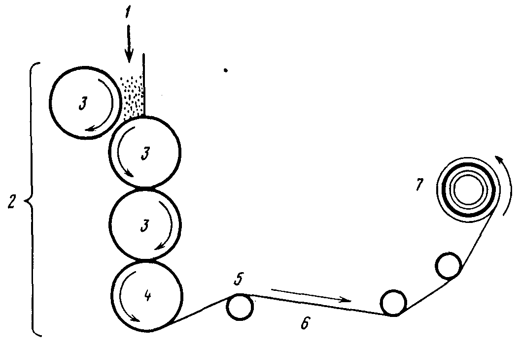 / — полимерный компаунд; 2 — каландровочные валки: горячие (3) и холодный (4); 5 — каландрованный лист; б — направляющие валки; 7 — сматывающее устройство