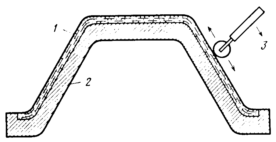 1 - чередующиеся слои полимера и стеклоткани; 2 - пресс-форма; 3 - прокатывающий ролик
