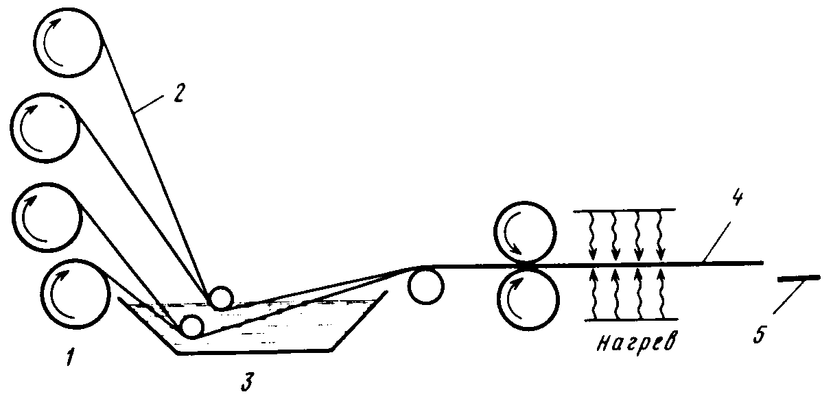 1— подающие катушки; 2 — непрерывные листы стеклоткани; 3 — ванна для пропитки в смеси смолы с отвердителем; 4 - непрерывный слоистый пластик; 5 - слоистый пластик, нарезаемый на куски необходимого размера
