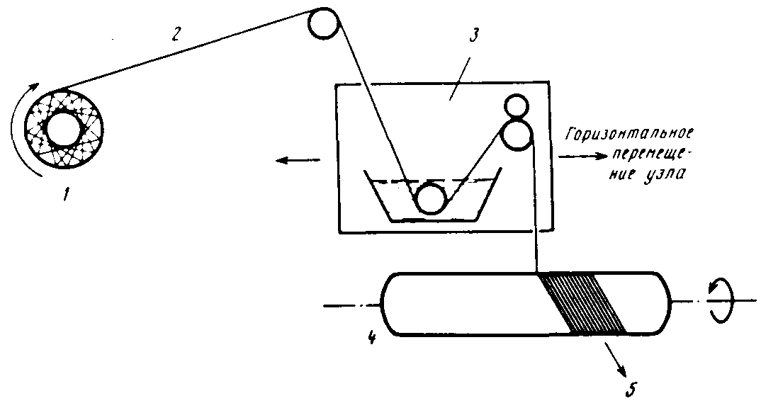 1- подающая катушка; 2 - непрерывная нить; 3 - узел для пропитки волокна и отжима смолы; 4 - сердечник; 5 - пропитанные смолой волокна, намотанные на сердечник