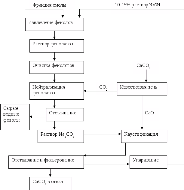 Для извлечения фенолов из фракций применяют экстракцию полярными растворителями, чаще всего метанолом и его водными растворами (рис. 1.1), а также экстракцию щелочью с переводом фенолов в феноляты. Последний способ обеспечивает наиболее полное и селективное извлечение фенолов, но связан с необратимым расходованием больших количеств достаточно дорогой щелочи. Используемая в промышленности каустификация содовых растворов, получаемых после разложения фенолятов, влечет за собой значительные расходы и образование больших объемов сточных вод (рис. 1.2).