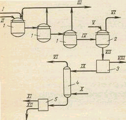 Для обесфеноливания щелочной экстракцией чаще всего применяют двухступенчатую схему (рис. 1.3), обеспечивающую достаточно полное извлечение фенолов и в то же время полное использование щелочи. Используется самое разнообразное оборудование: аппараты с мешалками периодического и непрерывного действия, шаровые смесители, полые противоточные колонны, колонны с насадкой или ситчатыми тарелками, пульсационные колонны. В принципе лучшими аппаратами для экстракции фенолов являются центробежные экстракторы. Малое поверхностное натяжение на поверхности раздела масло - щелочь делает особенно важным и сложным разделение фаз. Эта задача решается при использовании центробежных экстракторов. Однако их применение предъявляет особо жесткие требования к содержанию механических примесей в масле и щелочи