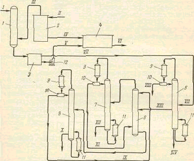Аппараты: 1—скруббер для разложения фенолятов; 2—печь для обжига известняка; 3—сепаратор для разделения фенолов и раствора соды; 4 — блок каустификации; 5 — колонна для отделения фенолов от воды и смолистых веществ: 6 — экстрактор для разделения фенолов и тиофенолов; 7 — колонна для отделения бензина от тиофенолов: 8 — колонна для отделения метанола от фенолов: 9—конденсаторы; 10—делители орошения; 11—подогреватели;12—насос. Потоки: I—отходы щелочной очистки дистиллятов нефти; II—известняк: III—двуокись углерода: IV—окись кальция: V— раствор соды; VI—раствор едкого натра: VII — водные сырые фенолы: VIII — вода, содержащая фенолы; IX— метанол; X — очищенные фенолы на ректификацию; XI — бензин; XII — тиофенолы на ректификацию: XIII — фенолы. освобожденные от воды и смолистых веществ, на очистку от тиофенолов; XIV — кубовые остатки.