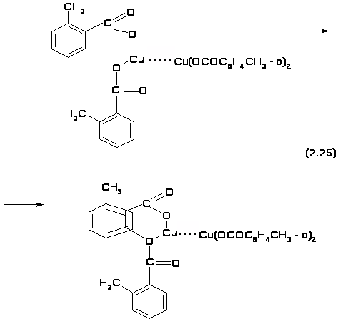 Здесь близость атома кислорода к орто-положению (по отношению к карбоксильной группе) допускает нуклеофильную атаку в это положение. Ионизация связи медь-кислород увеличивает возможность такой атаки.
