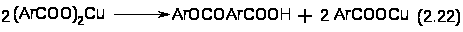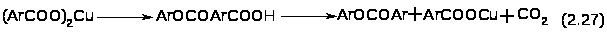 Термическое разложение бензоата меди было описано еще в 1845 г., позднее появился ряд статей, касающихся данного вопроса. Эти работы показали, что при сухой перегонке бензоата образуются фенол, бензол, бензойная кислота, салициловая кислота, фенилбензоат. В пятидесятые годы нашего столетия появилась серия патентов, предлагавших применение этого процесса для получения фениловых эфиров и фенолов из арилкарбоновых кислот и арилсульфокислот. Важным и интересным является то обстоятельство, что гидроксильная группа получаемого фенола становится в орто-положение к удаляемой карбоксильной или сульфогруппе. Так, из о- и n-толуиловых кислот, а также из n-толуолсульфокислоты образуется м-крезол, из м-толуиловой — о- и п-крезолы, из о-хлорбензойной и п-хлорбензойной кислот —- м-хлорфенол; из мезитиленовой кислоты 2,4-ксиленол, из α- и β-нафтойных кислот β-нафтол.