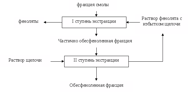 Обесфеноливанию подвергают низкокипящие (выкипающие до 300°С) фракции смол. Это бензино-лигроиновая и керосиновая фракции первичных смол, фенольная, нафталиновая и поглотительная фракции каменноугольной смолы. Обесфеноливание высококипящих фракций, особенно поглотительной фракции, давно является предметом дискуссий. Дело в том, что содержание фенола, крезолов и ксиленолов в поглотительной фракции незначительно, к тому же она является основным источником смолистых веществ, загрязняющих фенолы и образующих при ректификации вязкие, непригодные для использования кубовые остатки, которые значительно усложняют переработку фенолов. Достаточно сказать, что фенолы поглотительной фракции вносят в смесь фенолов всего 5% низкокипящих фенолов, но зато более 80% смолистых материалов.