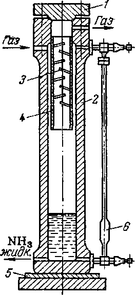 Внутри цилиндра на металлических стержнях укреплены отбойники 3, представляющие собой стальные полудиеки, повернутые друг к другу под углом 30°. Уносимые газом брызги жидкого аммиака ударяются об отбойники и стекают вниз. Газ, освобожденный от жидкости, выходит из сепаратора через верхнее отверстие, жидкий аммиак удаляется из аппарата снизу. Для предотвращения прорыва газа в жидкостной трубопровод (что очень опасно) в сепараторе всегда поддерживается определенный уровень жидкого аммиака при помсщи регулятора уровня, получающего соответствующий импульс от бхйковой камеры 6.