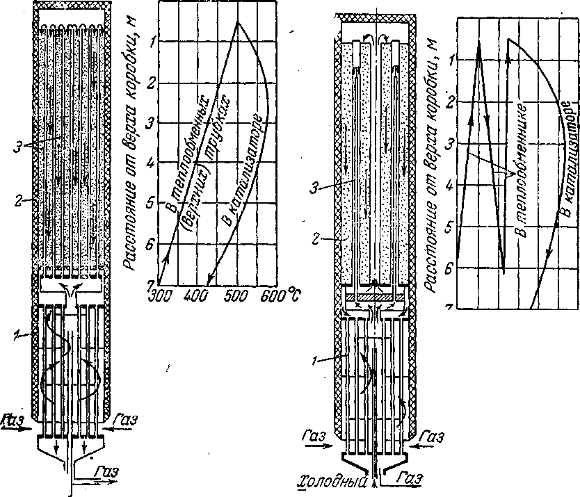 катализатора должно соответствовать оптимальной температурной кривой (см. рис. У1-2, стр. 277). Для обеспечения оптимального режима должно быть правильно определено соотношение размеров предварительного теплообменника и катализаторной коробки и организован отвод тепла из зоны реакции таким образом, чтобы исключалась возможность как перегрева, так и переохлаждения катализатора.
