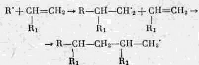 С. С. Медведев и сотрудники показали, что весь процесс полимеризации, инициированной свободными радикалами, протекает при помощи последних; растущая цепь полимера является свободным радикалом. Образование полимера происходит за счет взаимодействия свободного радикала с двойной связью мономера: