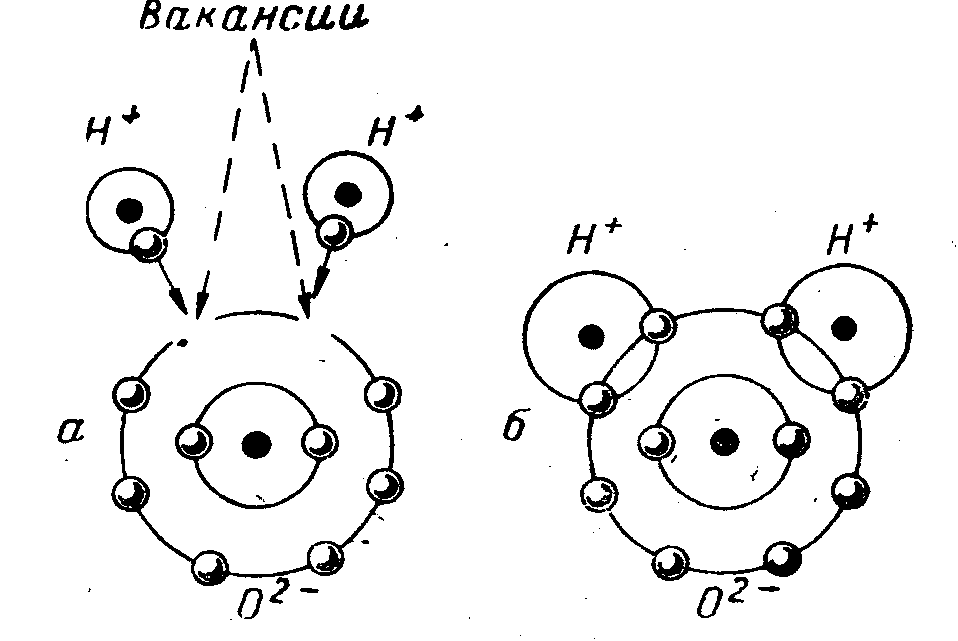 Рис 1. Схема образования молекулы воды (б) из 1 атома кислорода и 2 атомов водорода (а).