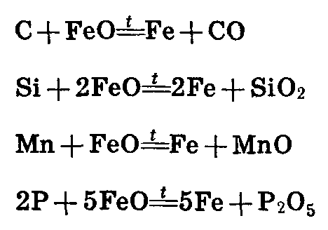 Закись железа, перемешиваясь с расплавом, окисляет кремний марганец и углерод: