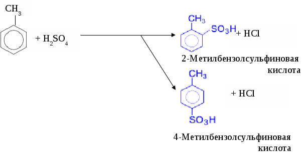 3) Сульфирование метилбензола концентрированой серной кислотой тоже приводит к образованию смеси 2- и 4-замещённого изомеров:
