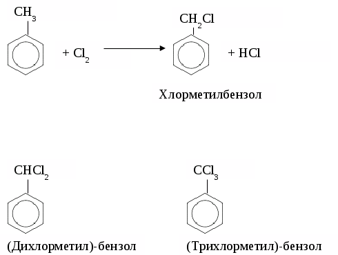 Реакции в боковой цепи. Метильная группа в метилбензоле может вступать в определённые реакции, характерные для алканов, но также и в другие реакции, не характерные для алканов.