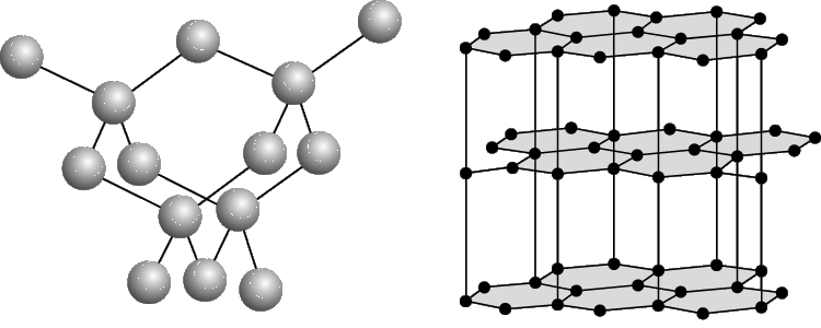 Физические и химические свойства. Известны четыре кристаллические модификации углерода: графит, алмаз, карбин и лонсдейлит. Графит - серо-чёрная, непрозрачная, жирная на ощупь, чешуйчатая, очень мягкая масса с металлическим блеском, обладает электропроводимостью. Атомы расположены параллельными слоями, образуя гексагональную решетку. Внутри слоя атомы связаны сильнее, чем один слой с другим, поэтому графит может расслаиваться. Сгорает при 700єС в рисутствии кислорода. Встречается в природе; получается искусственно. При высокой температуре, давлении и рисутствии катализатора (марганец Mn, хром Cr, платиновые металлы) графит превращается в алмаз. Алмаз - минерал, имеющий желтоватый, белый, серый, зеленоватый, реже голубой и черный цвет. Не проводит электрический ток, плохо проводит тепло. В кристалле атомы углерода образуют непрерывный трехмерный каркас, состоящий из сочлененных тетраэдров, что обеспечивает высокую прочность связей. Алмаз - это самое твердое вещество из всех известных. Температура плавления выше 3500єС. Химически стоек. Сгорает при 870єС в присутствии кислорода. При 1800єС в отсутствие кислорода превращается в графит. Прозрачные кристаллы; после обработки - бриллианты. Добывают из россыпей и коренных месторождений. Синтетический алмаз получают из графита при высоких давлении и температуре. Он чаще полупрозрачный или непрозрачный; имеет кристаллическую структуру и свойства природного алмаза. Жидкий углерод может быть получен при давлениях выше 10,5 Мн/мІ (105 кгс/смІ) и температурах выше 3700єС. Кокс, сажа, древесный уголь (твердый углерод) имеют то же строение, что и графит.Для твёрдого углерода характерно также состояние с неупорядоченной структурой - так называемый "аморфный" углерод, который не представляет собой самостоятельной модификации; в основе его строения лежит структура мелкокристаллического графита. Нагревание некоторых разновидностей "аморфного" углерода выше 1500-1600єС без доступа воздуха вызывает их превращение в графит. Физические свойства "аморфного" углерода очень сильно зависят от дисперсности частиц и наличия примесей. Плотность, теплоёмкость, теплопроводность и электропроводность "аморфного" углерода всегда выше, чем графита. Карбин получен искусственно. Он представляет собой мелкокристаллический порошок чёрного цвета (плотность = 2 г/смі). Построен из длинных цепочек атомов С, уложенных параллельно друг другу. Лонсдейлит найден в метеоритах и получен искусственно; его структура и свойства окончательно не установлены.