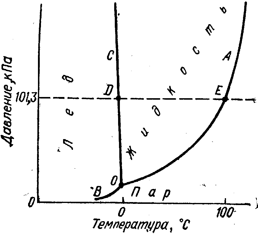Диаграмма показывает те состояния воды, которые термодинамически устойчивы при определенных значениях температуры и давления. Она состоит из трех кривых, разграничивающих все возможные температуры и давления на три области, отвечающие льду, жидкости и пару.