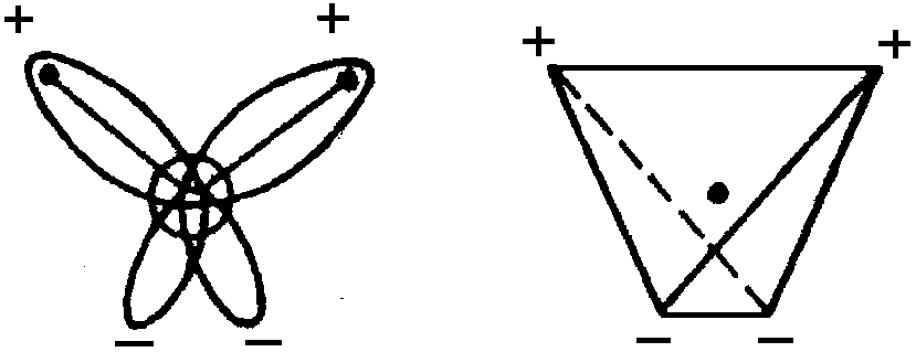 Валентный угол НОН (104,3°) близок к тетраэдрическому (109,5°). Электроны, образующие связи О—Н, смещены к более электроотрицательному атому кислорода. В результате атомы водорода приобретают эффективные положительные заряды, так что на этих атомах создаются два положительных полюса. Центры отрицательных зарядов неподелённых электронных пар атома кислорода, находящиеся на гибридных > >- орбиталях, смещены относительно ядра атома и создают два отрицательных полюса.