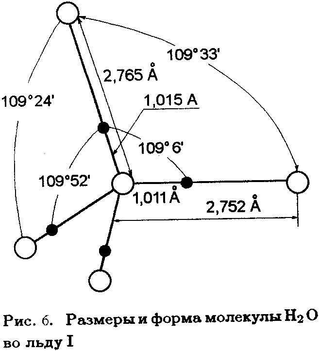 Важную роль водородные связи играют в структуре воды и льда. На рис. 6 показан фрагмент структуры льда Ι. Каждый атом кислорода в этой структуре тетраэдрически связан с четырьмя другими атомами кислорода, между ними располагаются атомы водорода; два атома водорода соединены с данным атомом кислорода полярной ковалентной связью (d=1,011Ǻ), два других — водородной связью (d=1,752 Ǻ; E>O>…>H> ≈ 5ккал/моль), т.е. входят в состав двух других молекул H>2>O. Создается ажурная структура, далекая от плотной упаковки. Отсюда небольшая плотность и значительная рыхлость льда. При плавлении льда водородные связи частично разрушаются (примерно на 10%); это несколько сближает молекулы, поэтому вода немного плотнее льда. Нагревание воды, с одной стороны, приводит к ее расширению, т.е. к увеличению объема, с другой стороны, оно вызывает дальнейшее разрушение водородных связей и тем самым уменьшение объема. В результате плотность воды проходит через максимум (при 4oC).
