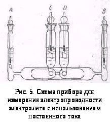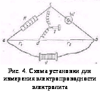 Сопротивление раствора определяется при таком положении контакта d, при котором в телефонной трубке не слышно никакого звука, и следовательно, ток в линии cd отсутствует. При этом положении контакта согласно закону Кирхгофа сопротивления R, W, r>1>, r>2> связаны соотношением