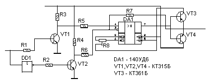 Для улучшения параметров схемы и защиты ОУ от перегрузок по входу и выходу параллельно резистору-датчику можно включить стабилитрон КС136А (на схеме не показан).