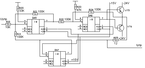 Модуль цифро-аналогового преобразования построен на интегральной микросхеме ЦАП типа К572ПА1 – восьмиразрядный цифро-аналоговый преобразователь. Для получения сигналов напряжения разной полярности был разработан управляемый источник опорного напряжения. Для получения сигналов тока, необходимых для управления пропорциональными распределителями, разработаны генераторы стабильного тока управления.