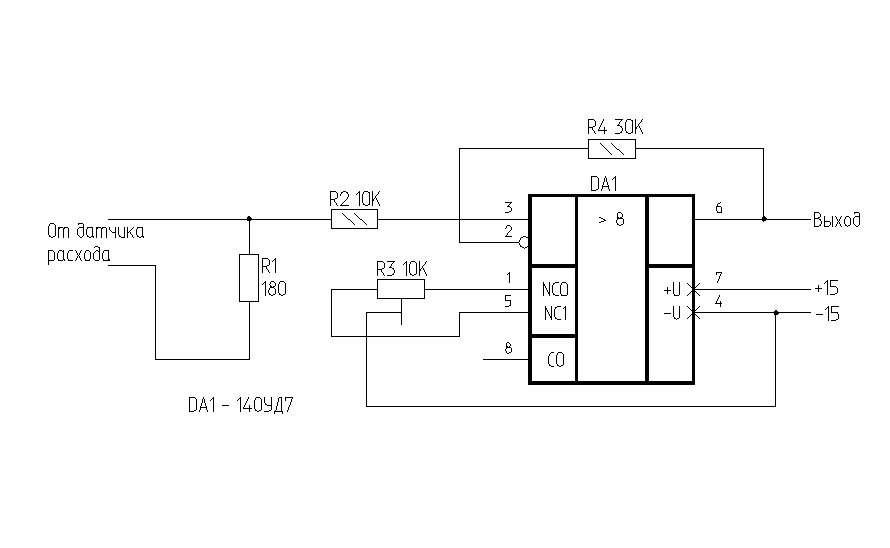 схема которого аналогична схеме сопряжения с датчиками расхода (исключается резистор – датчик напряжения R1). Величина сопротивления резистора обратной связи: