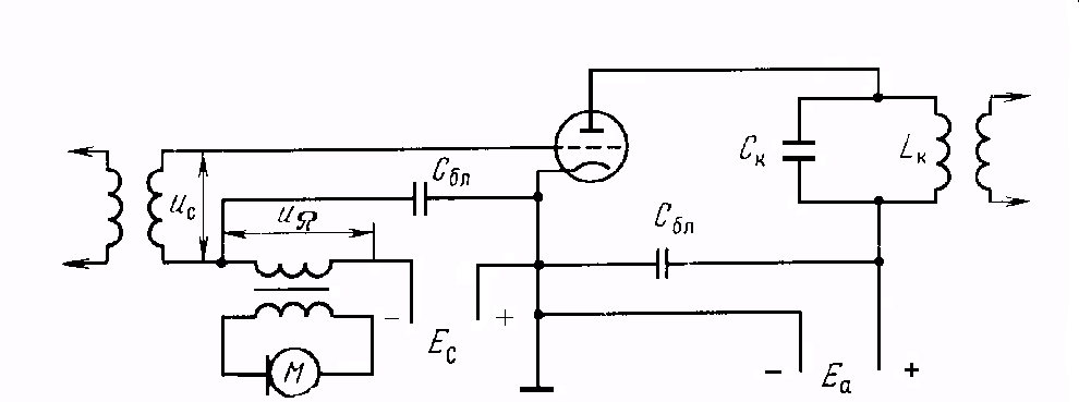 Усиление модулированных колебаний в режиме с углом отсечки θ = 90° широко применяют в однополосных передатчиках. Принципиальная схема усилителя амплитудно-модулированных колебаний (УМК) приведена на рис. 9. Поскольку на вход УМК подаются радиочастотные колебания с изменяющейся амплитудой, схемы УМК не отличаются от схем обычных генераторов с внешним возбуждением.