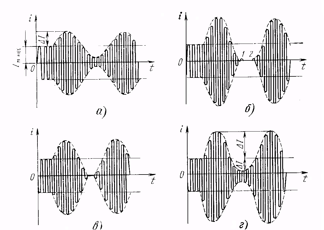 Таким образом, в результате изменения напряжения смещения амплитуда импульсов анодного тока, угол отсечки θ , а следовательно, и амплитуда первой гармоники анодного тока изменяются по звуковому закону, вследствие чего и осуществляется амплитудная модуляция (точки 3, 4, 5 и 6 на рис. 5).