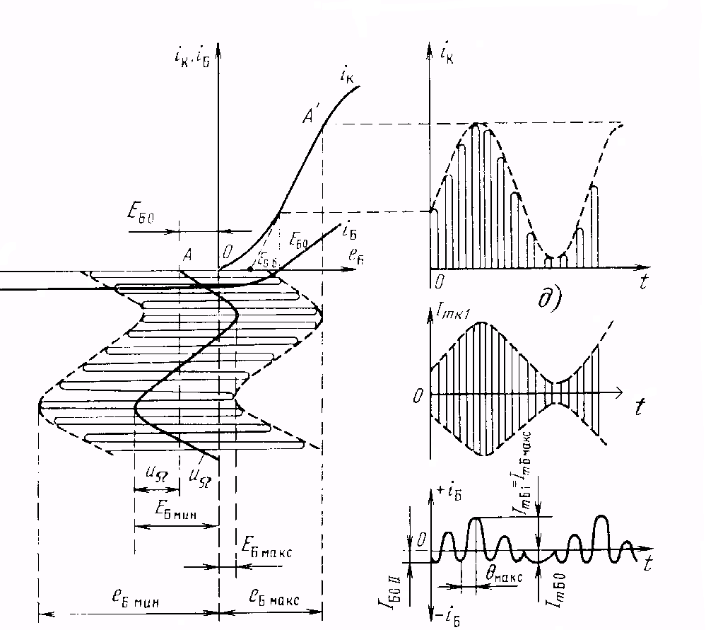 Если в цепи базы кроме напряжения смещения и напряжения возбуждения включено и звуковое напряжение u>Ω> =U>Ω>cosωt, то результирующее напряжение е>Б> = Е>Б 0> + U>Ω>cosωt + U>ω> cos ωt . Так как напряжение звуковой частоты изменяется значительно медленнее, чем напряжение возбуждения, то напряжение звуковой частоты проявляется по отношению к напряжению возбуждения, как напряжение смещения. Поэтому при модуляции рабочая точка будет перемещаться по характеристике, как показано на рис. 7,г (точки А— A'). В результате изменяются амплитуда импульсов коллекторного тока и угол нижней отсечки θ (рис. 7,д). Поэтому в нагрузочном колебательном контуре амплитуда тока будет изменяться по закону звуковой частоты (рис. 5.9,е). Ток в цепи базы во время положительного полупериода звукового напряжения протекает в виде импульсов меняющейся полярности. Во время отрицательного полупериода ток в цепи базы—постоянный отрицательный.