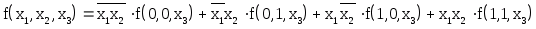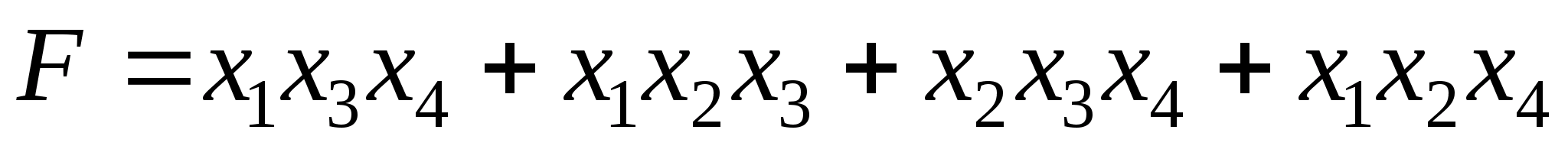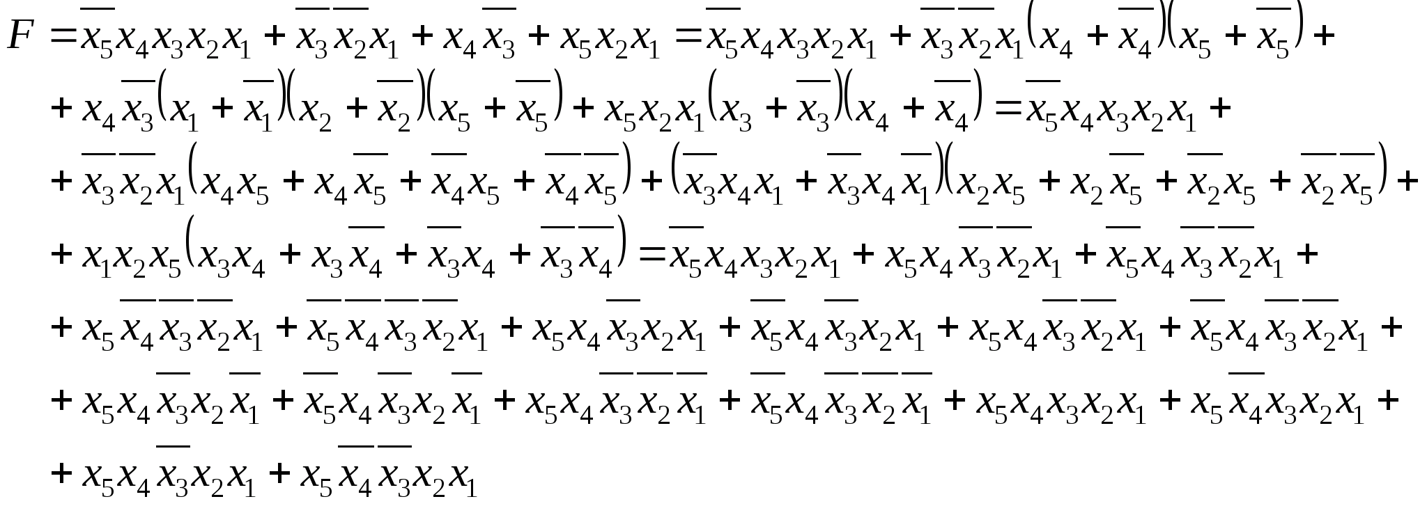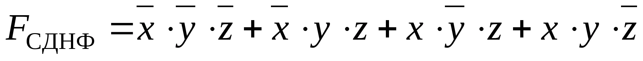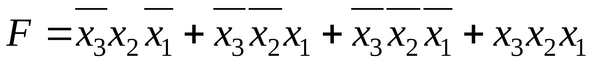 записываем для этих наборов конъюнкции, при этом если переменная равна 1, то эта переменная записывается без отрицания, если же переменная равна 0, то такая переменная записывается с отрицанием;