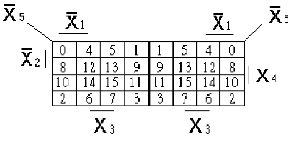 Основой будем считать карту Карно для четырех аргументов; из двух таких карт формируется карта для пяти аргументов, из четырех таких карт - карта Карно для шести аргументов. Так как аргументы являются переменными двоичного алфавита, то наборы аргументов можно рассматривать как целые двоичные числа.