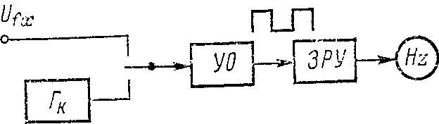Структурная схема конденсаторного частотомера, в котором использован этот метод (рис. 11), состоит из усилителя-ограничителя УО и Зарядно-разрядного устройства ЗРУ с магнитоэлектрическим индикатором. Кроме того, имеется генератор Г>к> для калибровки частотомера на одной фиксированной частоте. На вход частотомера поступает напряжение измеряемой частоты. В усилителе-ограничителе оно принимает форму меандра. Меандр управляет зарядно-разрядным устройством, схема которого приведена на рис. 2.