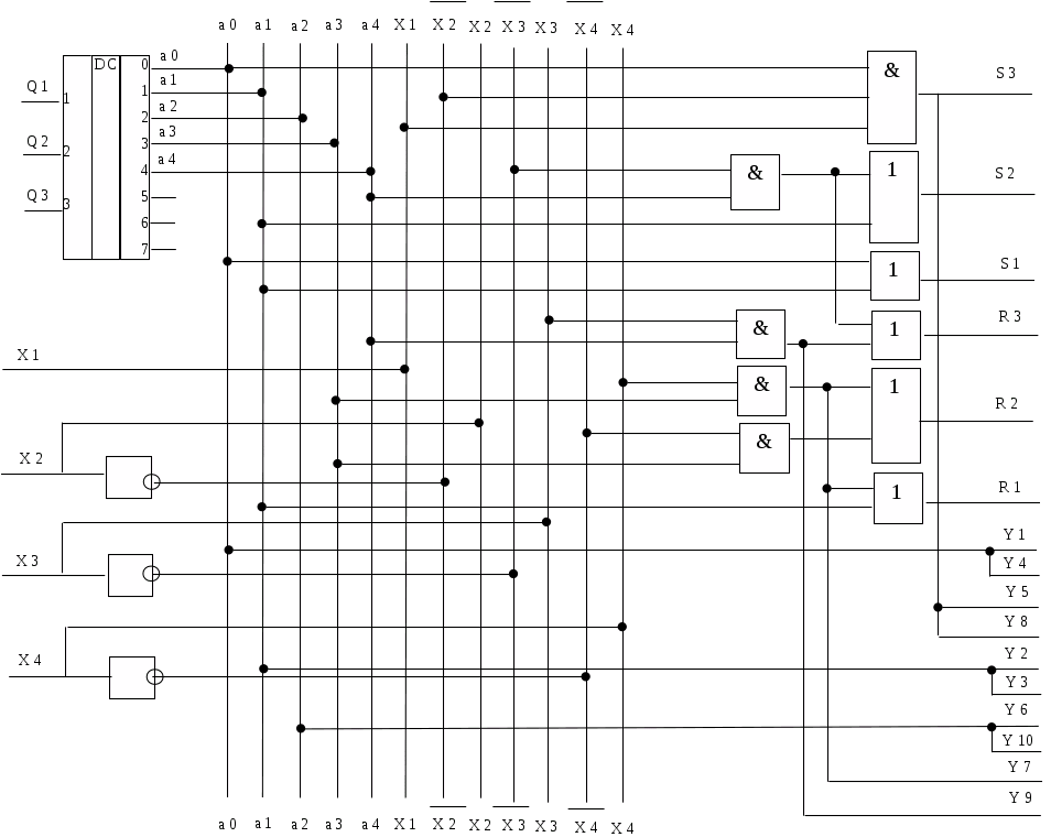 Входящие в выражения значения a0, a1, a2, a3, a4, определяемые комбинацией значений Q>3>, Q>2>, Q>1> могут быть получены с помощью дешифратора.