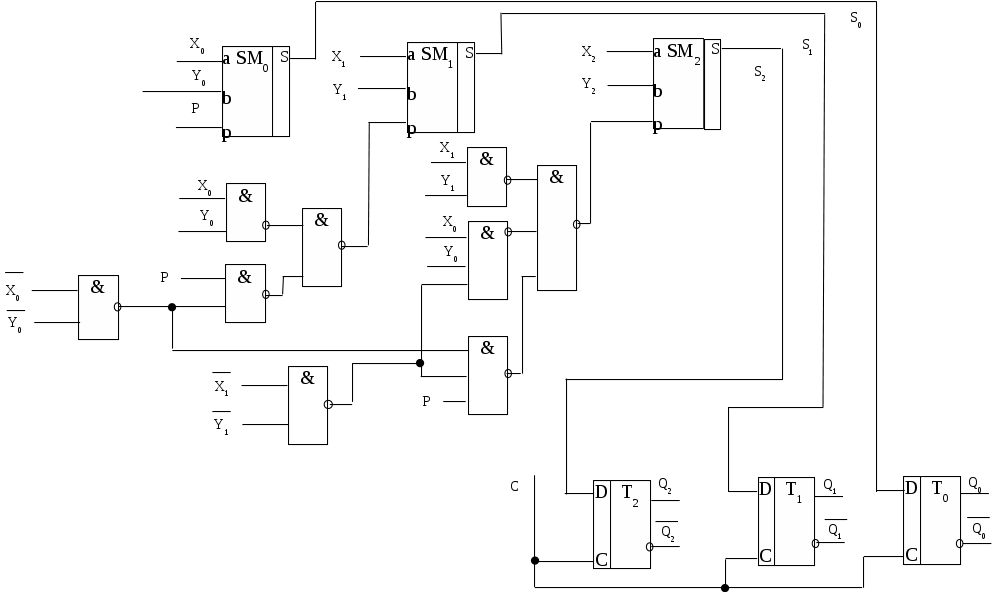 Одноразрядный сумматор рис.1 имеет три входа (два слагаемых и перенос из предыдущего разряда) и два выхода (суммы и переноса в следующий разряд).