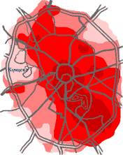 Характеризуя распределение уровня загрязнения по территории города, к зонам неблагоприятной и крайне неблагоприятной экологической обстановки следует отнести автомагистрали, где повышенный уровень загрязнения отмечен по 5 веществам. На Варшавском шоссе содержание формальдегида составляет 4,3 ПДК с.с., диоксида азота – 2,5 ПДК с.с., бенз(а)пирена, оксида углерода и фенола – 1,0 – 1,8 ПДК с.с. На Сухаревской площади (Садовое кольцо) уровень загрязнения воздуха диоксидом азота превышал норму в 2,5 раза, оксидом азота, формальдегидом, оксидом углерода, фенолом - до 1,6 ПДК с.с. Умеренно неблагоприятной может быть названа экологическая обстановка почти на всей остальной территории города. Здесь отмечается повышенный уровень загрязнения (1,0-3,0 ПДК с.с.) воздуха по двум-трем веществам.