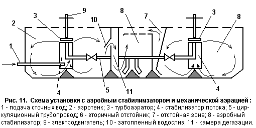 На рис.11 показана схема установки с аэробной стабилизацией активного ила и механическими аэраторами. Эти сооружения выполняют в блочном варианте что позволяет набирать необходимую производительность (700-400 куб.м в сутки и более).