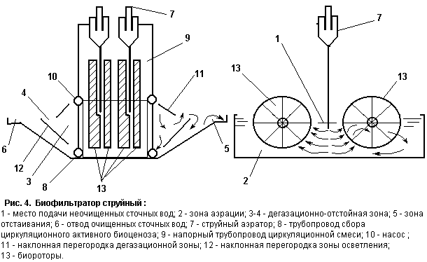 Струйный биофильтр работает следующим образом. Сточные воды, прошедшие механическую очистку, попадают в аэрационную зону, куда также поступает смесь осветленной жидкости и циркуляционного активного ила. Эта смесь из нижней части осветляется забирается по трубопроводу насосом и через струйный аэратор шахтного типа сбрасывается в аэрационную зону биофильтра. Струя потока вводится в межсекционное пространство (Рис. 4) ниже свободной поверхности на 15-30 см и отражается от специально спланированной поверхности дна. В результате возникают интенсивные воздушные восходящие потоки, которые приводят к движению биоротора.