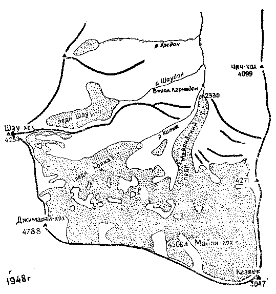 В 1964-1965 гг. весь левый, сильно изрезанный трещинами бок Майлинского ледника не только полностью покрыл левую береговую морену, по которой еще в 1961 году проходила тропа к Колкинскому леднику, но и свисал с нее большими фестонами к реке Колка. Это убедительно говорило о том, что Майлийский ледник оживился и перешел в стадию наступления. Вместе с тем, можно было ожидать и новой подвижки ледников в верховьях Геналдонского ущелья. Она произошла в конце сентября 1969 года.