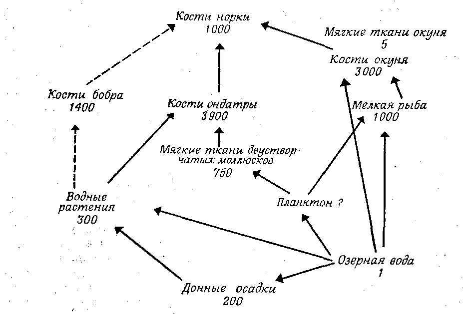 Фиг. 226. Накопление стронцня-90 в разных частях сети питания одного небольшого канадского озера, получающего низкоактивпые отходы. Цифры, указывают средние коэффициенты накопления относительно озерной воды, коэффициент накопления которой принят за единицу.