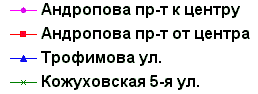 На основании этого графика можно сделать вывод, что на проспекте Андропова количество автотранспорта сокращается в течении недели и достигает минимума в воскресение. Это можно объяснить тем, что этот проспект является центральной магистралью, служащей связью между центром и «спальными» районами, по которой в рабочие дни люди ездят на работу. На улице Трофимова минимальное количество автотранспорта наблюдается в четверг-пятницу и возрастает ближе к концу недели, что можно объяснить наличием «центрального» авторынка района Южнопортовый и прилегающих районов, одним из подъездных маршрутов к которому является ул. Трофимова, и основная масса людей, посещающих его, приходится на выходные дни.