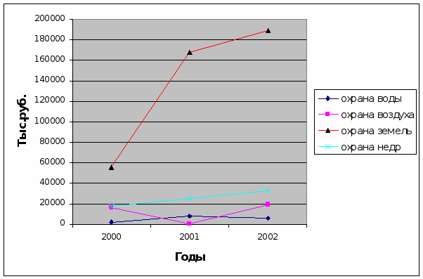 Во второй главе был произведен анализ показателей природоохранной деятельности в динамике за 2000-2002 годы. Вследствие загрязнения земель и дальнейшей их рекультивации, внесения различных удобрений, ремонта трубопроводов большая доля затрат (77%) приходится на мероприятия по охране земель. Сравнительно небольшие затраты приходятся на мероприятия по охране атмосферного воздуха и охране водных ресурсов. Также с каждым годом наблюдается положительная тенденция увеличения затрат на мероприятия по охране земель и охране недр.