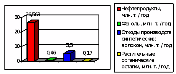 Среди вносимых в океан с суши растворимых веществ, большое значение для обитателей водной среды имеют не только минеральные, биогенные элементы, но и органические остатки.Вынос в океан органического вещества оценивается в 300 - 380 млн.т./год.Сточные воды, содержащие суспензии органического происхождения или растворенное органическое вещество, пагубно влияют на состояние водоемов.Осаждаясь, суспензии заливают дно и задерживают развитие или полностью прекращают жизнедеят данных микроорганизмов, участвующих в процессе самоочищения вод. При гниении данных осадков могут образовываться вредные соединения и отравляющие вещества, такие как сероводород, которые приводят к загрязнению всей воды в реке. Наличие суспензий затрудняют также проникновение света в глубь воды и замедляет процессы фотосинтеза. Одним из основных санитарных требований, предъявляемых к качеству воды, является содержание в ней необходимого количества кислорода. Вредное действие оказывают все загрязнения, которые так или иначе содействуют снижению содержания кислорода в воде .Поверхностно активные вещества - жиры, масла, смазочные материалы- образуют на поверхности воды пленку, которая препятствует газообмену между водой и атмосферой, что снижает степень насыщенности воды кислородом. Значительный объем органических веществ, большинство из которых не свойственно природным водам, сбрасывается в реки вместе с промышленными и бытовыми стоками. Нарастающее загрязнение водоемов и водостоков наблюдается во всех промышленных странах. Информация о содержании некоторых органических веществ в промышленных сточных водах предоставлена на рисунке 1.